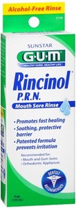 Alcohol and benzocaine free, no stinging or burning. Protective healing barrier forms a thin, invisible, protective coating that promotes healing. Butler Rincinol or G-U-M Rincinol P. Sunstar Americas mouth sore rinse is an alcohol free formula that is designed to provide you with fast pain relief without stinging, burning, numbing, or drying out your mouth. Its patented formula allows kids and adults to safely use the product even if accidentally swallowed.